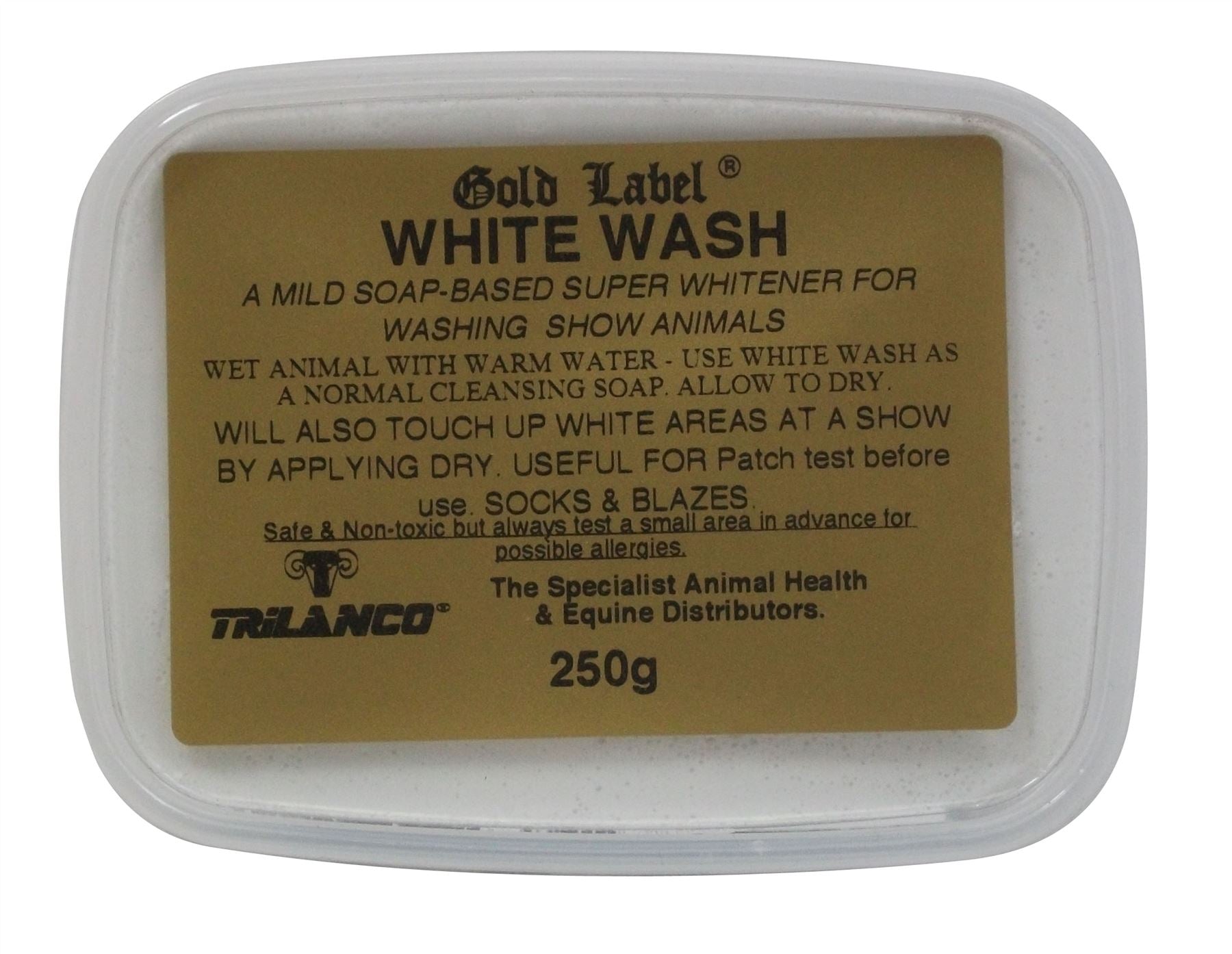 Shop now at Just Horse Riders for the Gold Label White Wash, a must-have for maintaining the pristine appearance of your cattle, white horses, and dogs. This soap block is specifically designed to leave a non-chalk super whitener on the coat, ensuring a standout shine throughout the show without any powder residue. It's also perfect for touching up white areas, enhancing the overall look of your animals. With our quick dispatch and delivery, you won't have to wait long to start seeing the results. If you have any questions about Gold Label White Wash, don't hesitate to contact us. We pride ourselves on our high-quality customer service and are always ready to assist you.