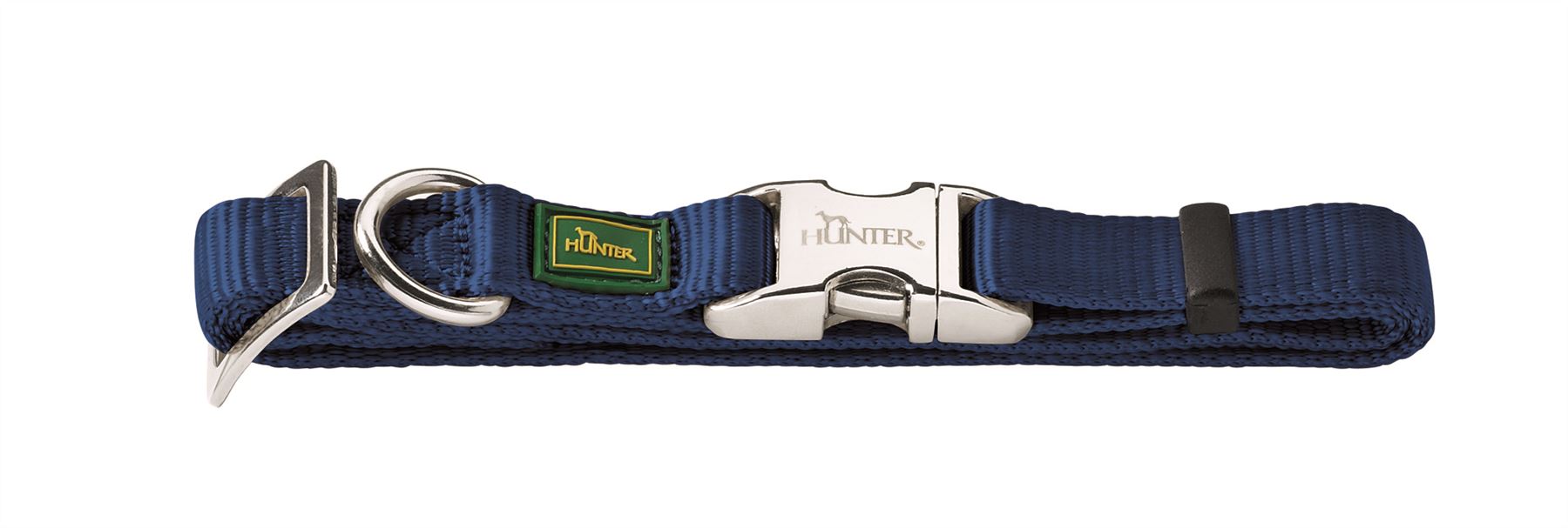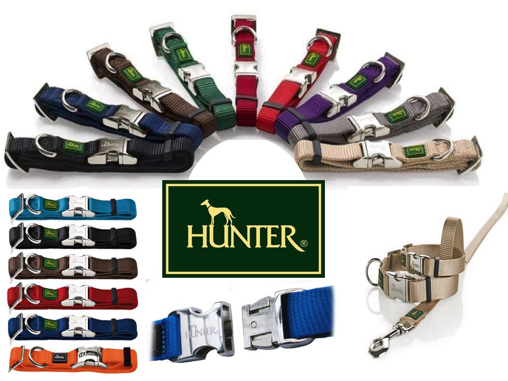 Hunter Dog Collars, Leads and Training Leads Our top selling Hunter range is manufactured in Germany using soft polyamide nylon and fitted with a high-quality strong aluminum clasp that is particularly resilient. The low weight of the ALU-STRONG clip guarantees special wearing comfort. It is also easy to open and close. The collars are also fitted with a metal slide so the size can be individually adjustable. These collars can not be worn in sea as salt can corrode the metal clasp.