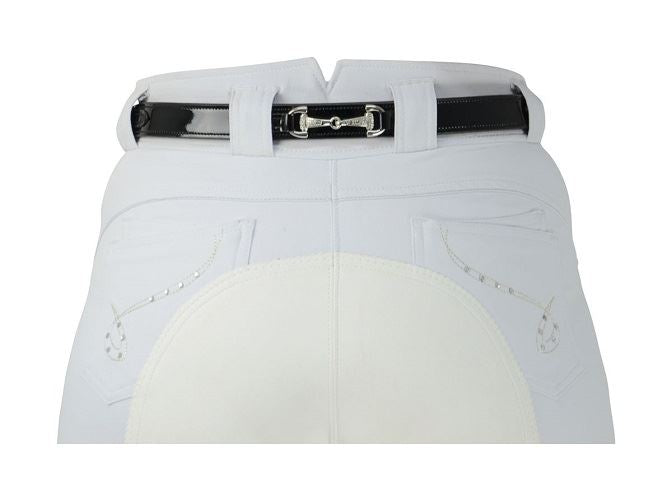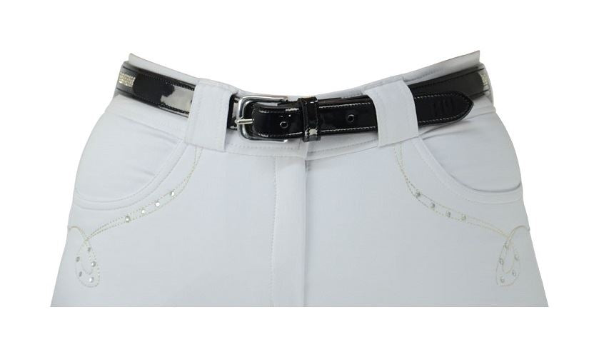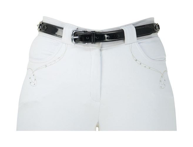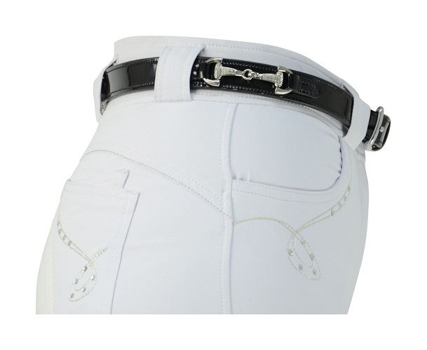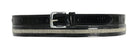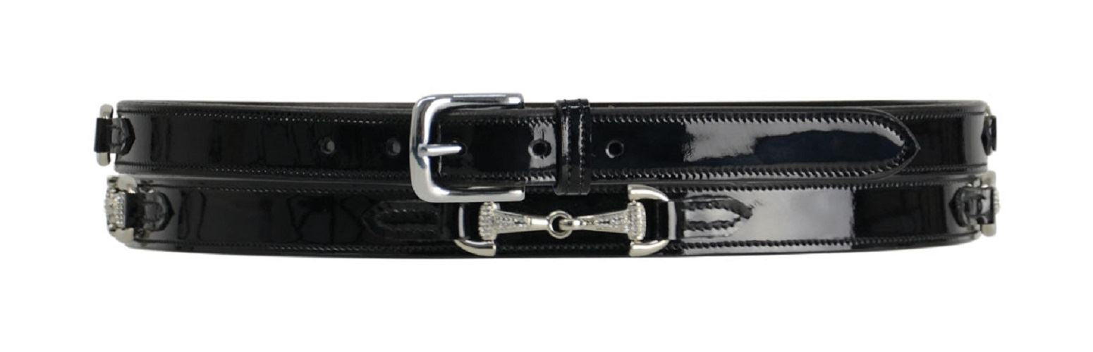 This is a Patent leather belt with three crystal snaffle bits to add a hint of bling to a smart look.This is Ideal for wearing with white breeches for competition, or for extra sparkle to a casual outfit.