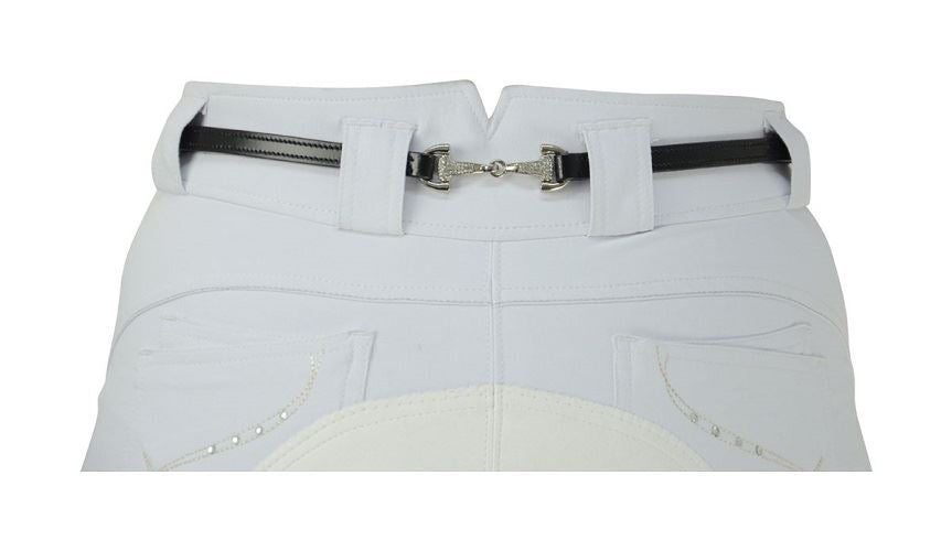 This is A stunning leather belt featuring three snaffle bits with intricate crystal detailing. Perfect to match with competition breeches, or to add some sparkle to a casual outfit.