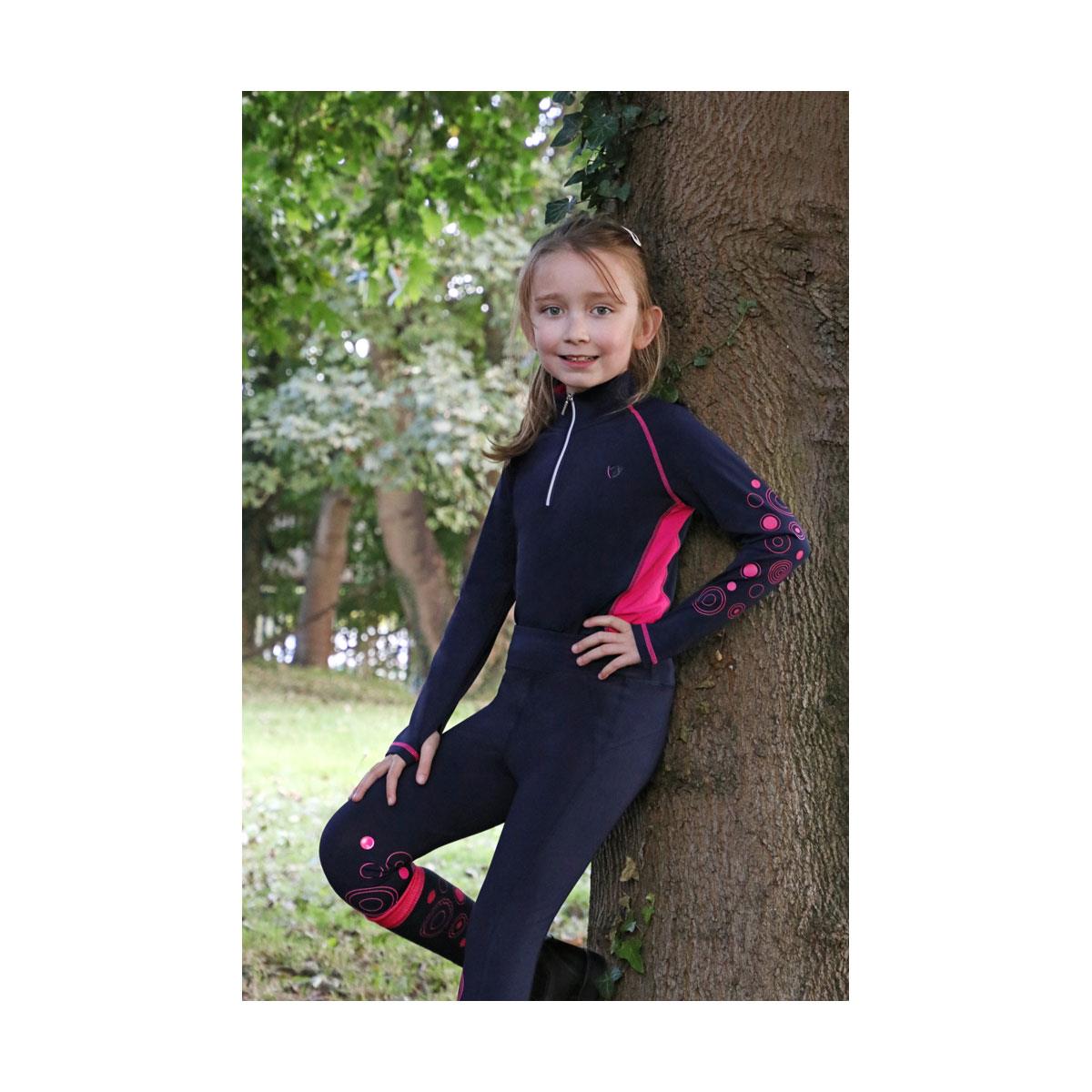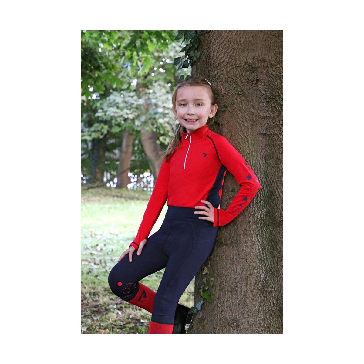 This is the perfect base layer for training or galloping round a cross country course, ideal for the active equestrian! With a snazzy, silicone ecliptic circle pattern on the arms in contrasting colours and matching flatlock stitching. This close fit base layer is made from soft, stretchable fabric and features a ¾ zip. Matching items available.