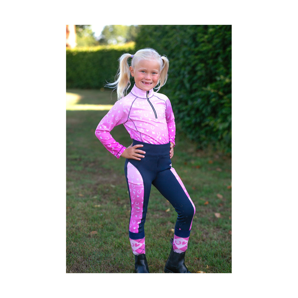 Made from a soft, breathable four way stretch fabric, this funky�base�layer will ensure your child stays comfortable and fresh all day long. The ombre pink material features glistening stars, horseshoes and love hearts, perfect for any�pony�lover! Featuring a silver half zip with navy piping for ease of dressing and matching classy navy flatlock stitching throughout. The Little Rider logo is embroidered on the chest. Coordinates perfectly with the�Pony�Fantasy�collection for a magical matchy matchy look!�