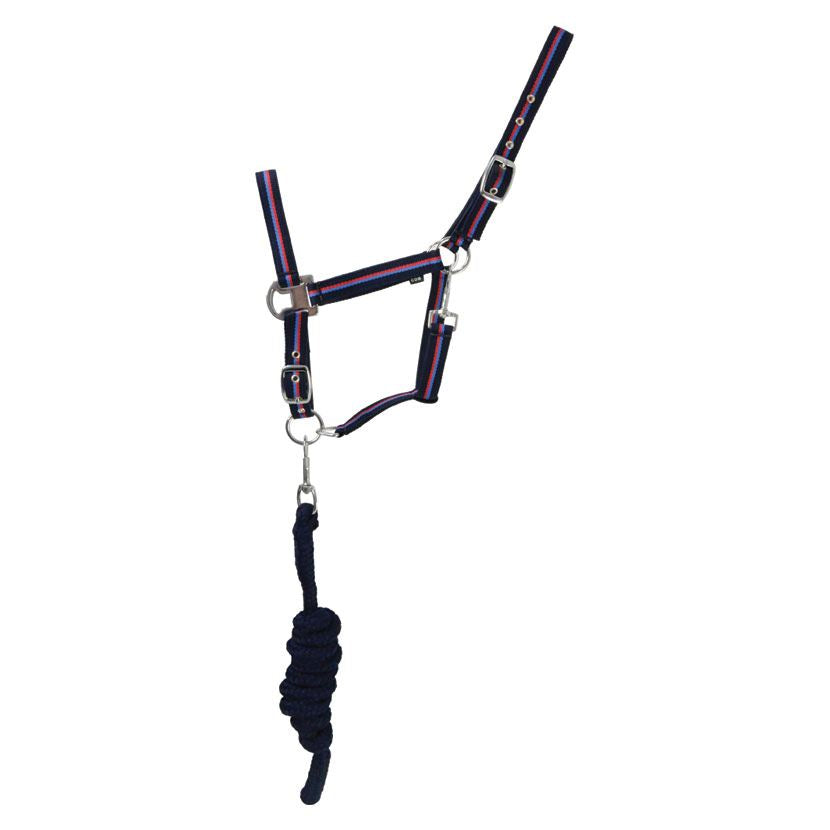 This super value head collar and lead rope set is both stylish and functional. With fully adjustable head piece and nose band for practicality and stainless steel buckles for an elegant finish. Coming in navy with red and blue detailing, this set is ideal for everyday use.
