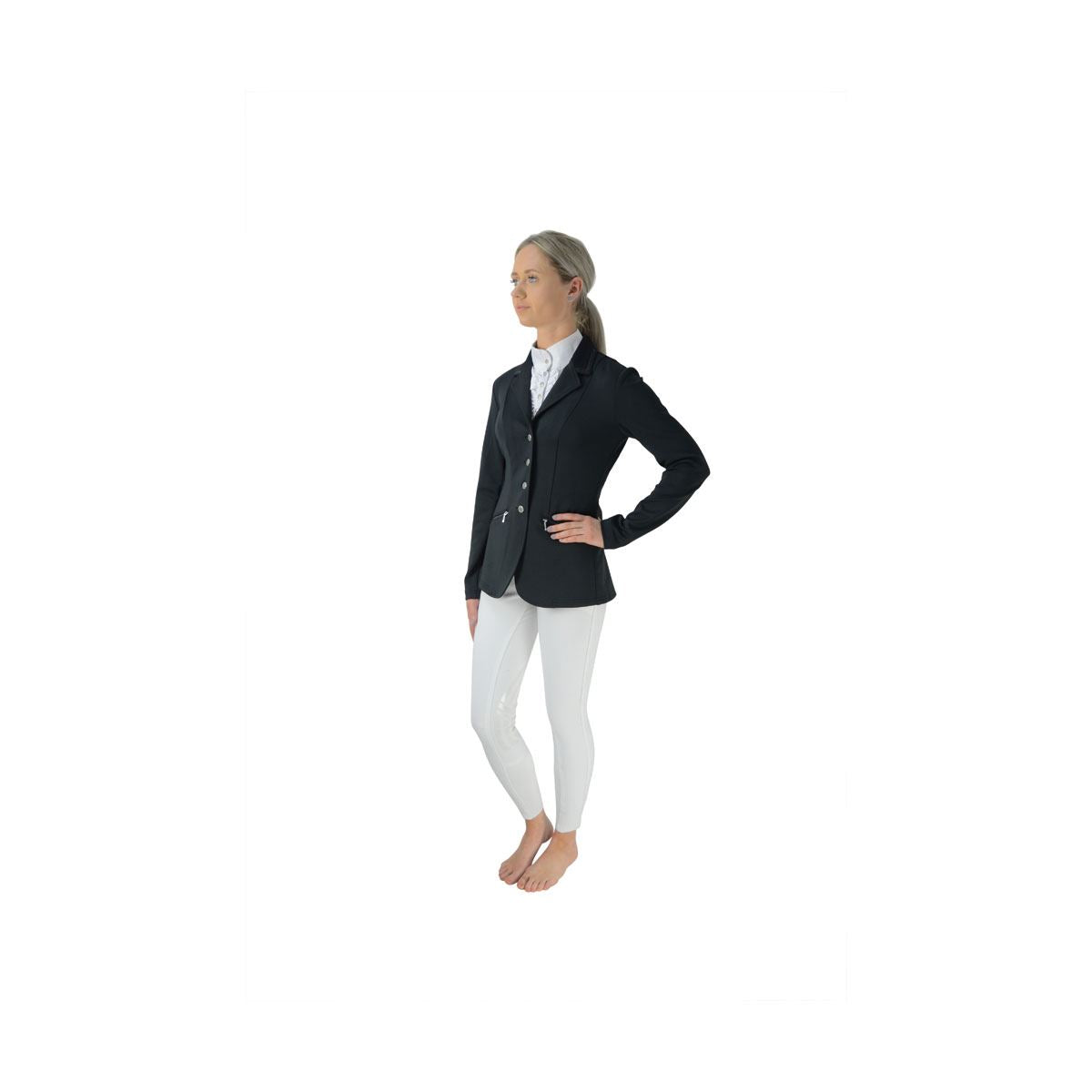 Designed for an active performance, this elegant fitted jacket is made from technical Flex-tech material to enable a full range of movement. The smart mesh overlay increases airflow to keep you cool and the technical stretch fabric is also quick drying. Four stunning diamante silver and black buttons fasten the jacket and the twin slits at the back ensure it sits correctly when you are in the saddle. The collar features subtle black diamantes on the trim which finish the look beautifully. Additional features include two front zipped pockets with silver YKK zips and contrasting mesh detail on the collar.