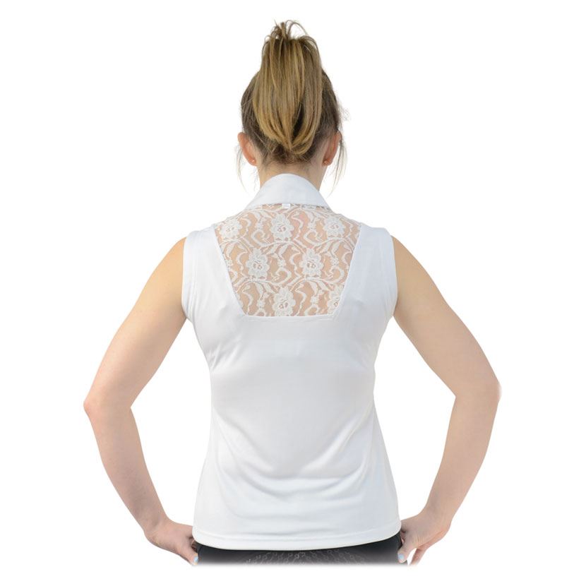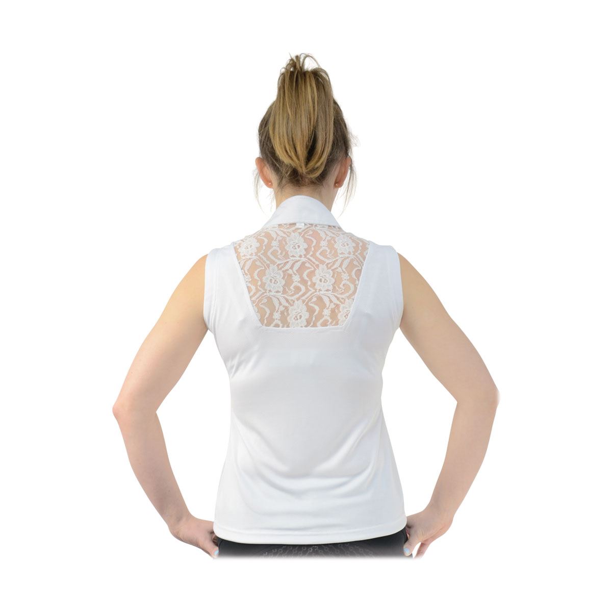 A sleeveless show shirt with stunning cut out lace detail on the back; a feature that can be easily concealed when wearing a jacket. Made from a technical fabric which is comfortable, breathable and incorporates bi-stretch for added freedom. Designed with pretty ruffle detailing and 5 crystal buttons down the front placket. A must have for the dressage enthusiast!