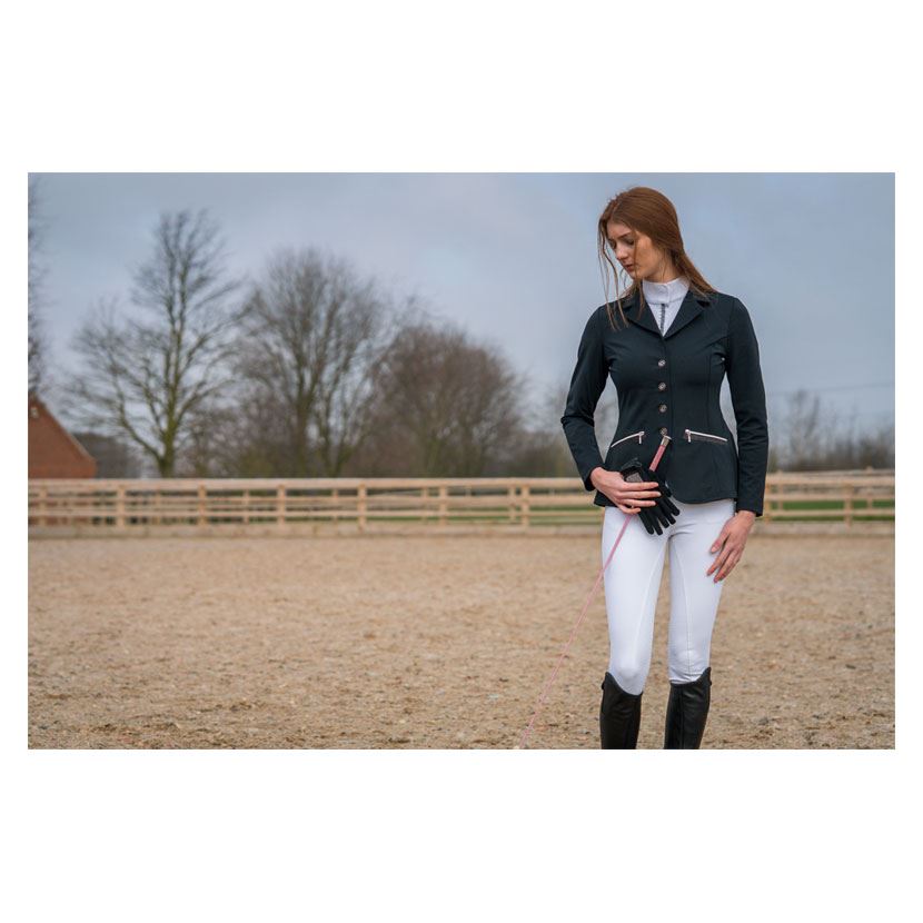 This gorgeous show jacket is the essential addition to your competition wardrobe! The sophisticated design incorporates black glitter panels along the collar that catch the light, matching the black glitter panels that line the silver zipped pockets. Designed with softshell material to guard against light showers and offer flexibility in the saddle, the comfort of this jacket is enhanced with the air vents under the arms to help you keep cool. Fastened with four silver lined black buttons for a secure fit, this show jacket is the ultimate choice for those who want to make an impression.