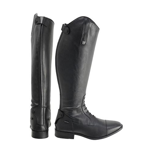 This is the elegant long boot that is perfect for the competitive or everyday rider. Fitted with lace fronts for the classic field boot look, these boots also benefit from an elasticated back panel that allows for a streamlined fit and added comfort. This boot sits close to your skin to allow precise, measured movement. The heel incorporates two rubber spur studs for optional use, and the boot is finished with a press button spur guard to the bottom of the boot. Fully lined for added comfort and sitting on an anti-skid sole, this secure, well-fitting boot is an excellent choice for competing or schooling. All HyLAND boots come with boot boxes, with a handy handle for carrying to help create an eye-catching retail display.