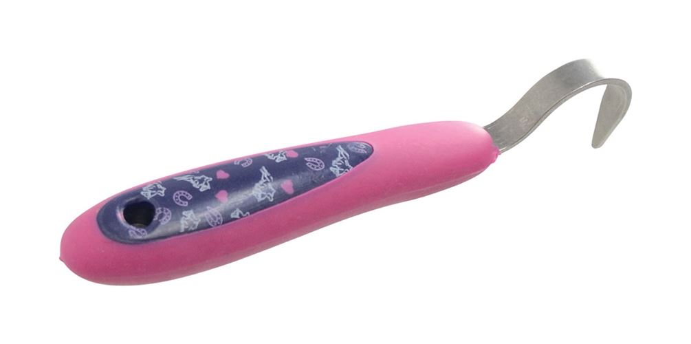 This is a Two tone soft touch hoof pick with a pretty horseshoe/heart/pony design.