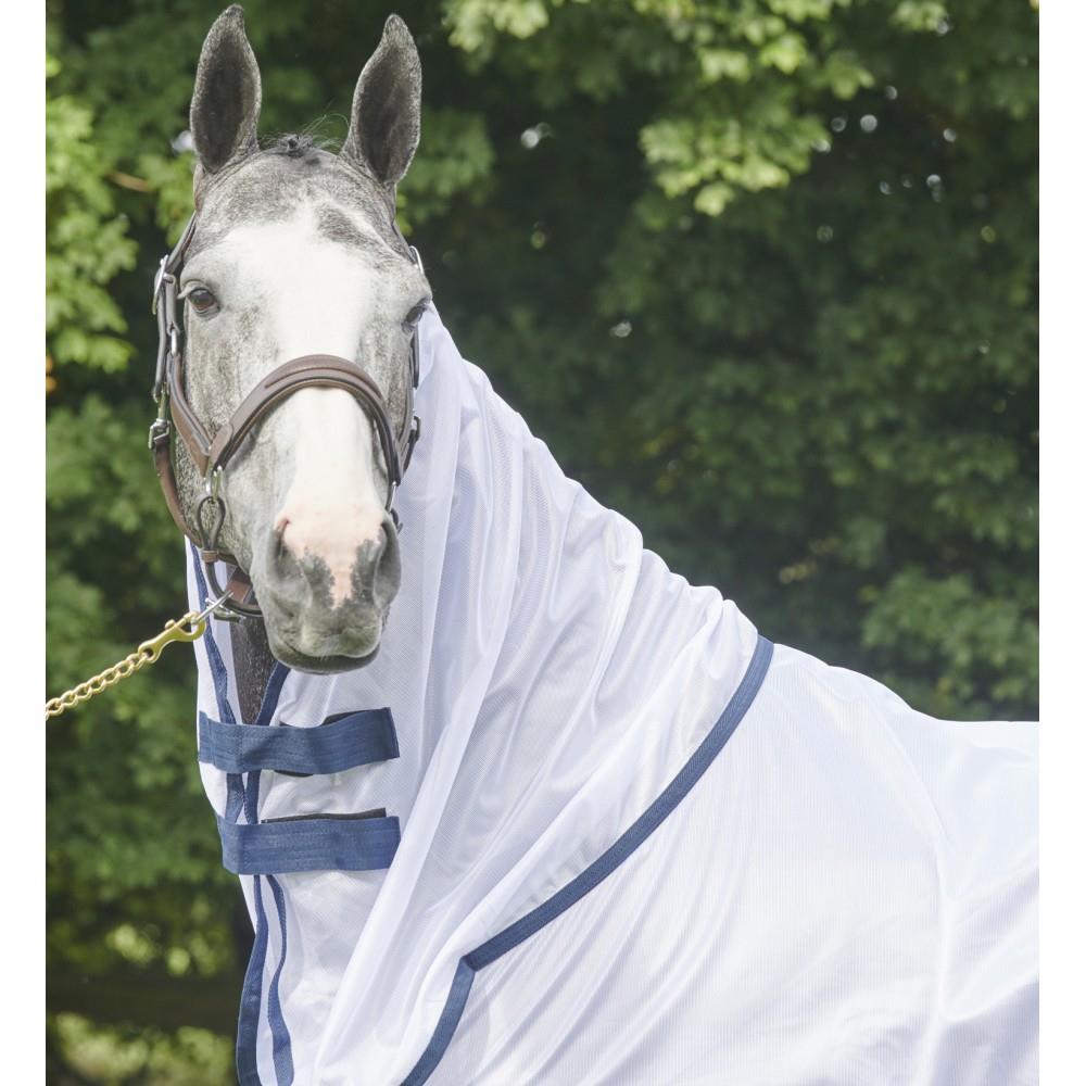 This fly mesh rug comes with an affixed hood for maximum fly protection. It's not just about functionality; it also features a roll-away design for easy storage and comes complete with a branded bag. The contrast navy webbing adds a touch of elegance to this practical rug.