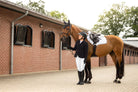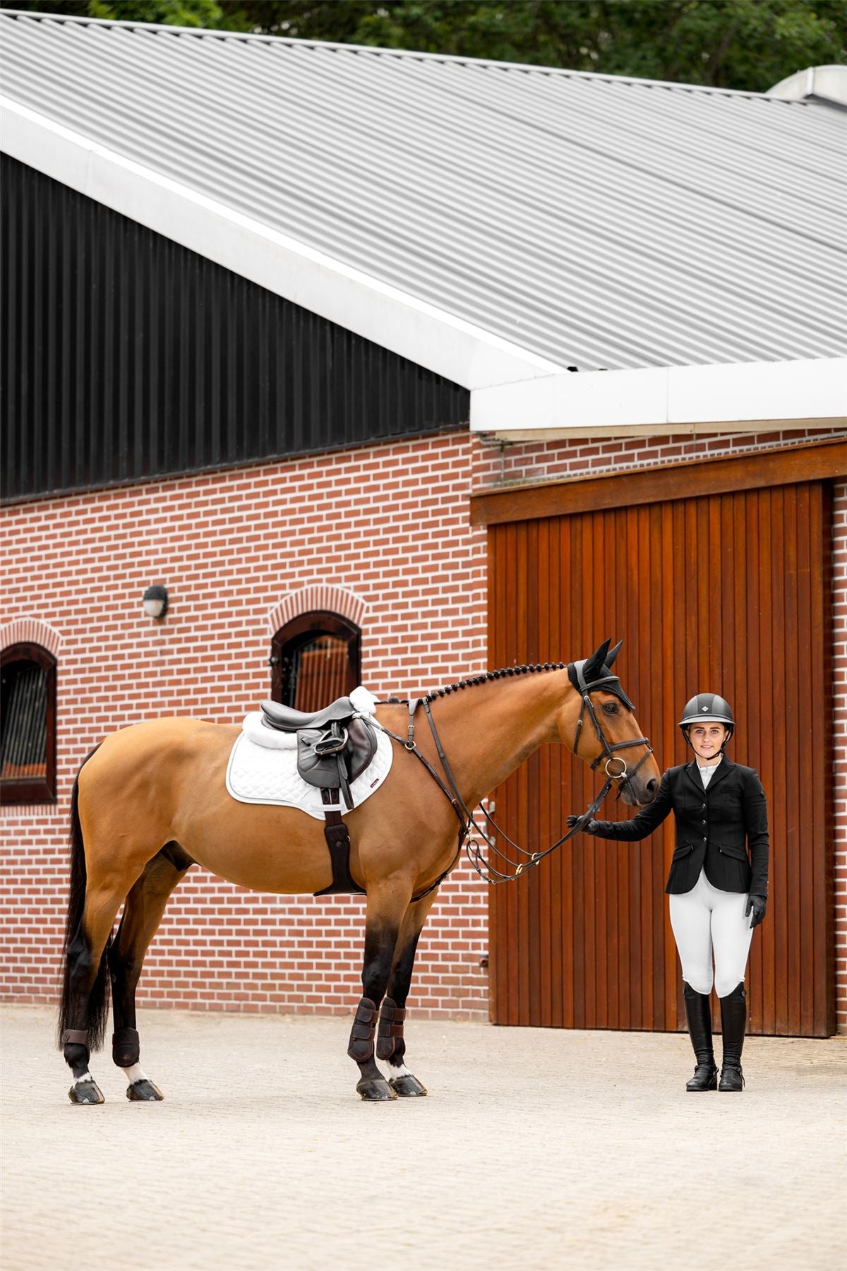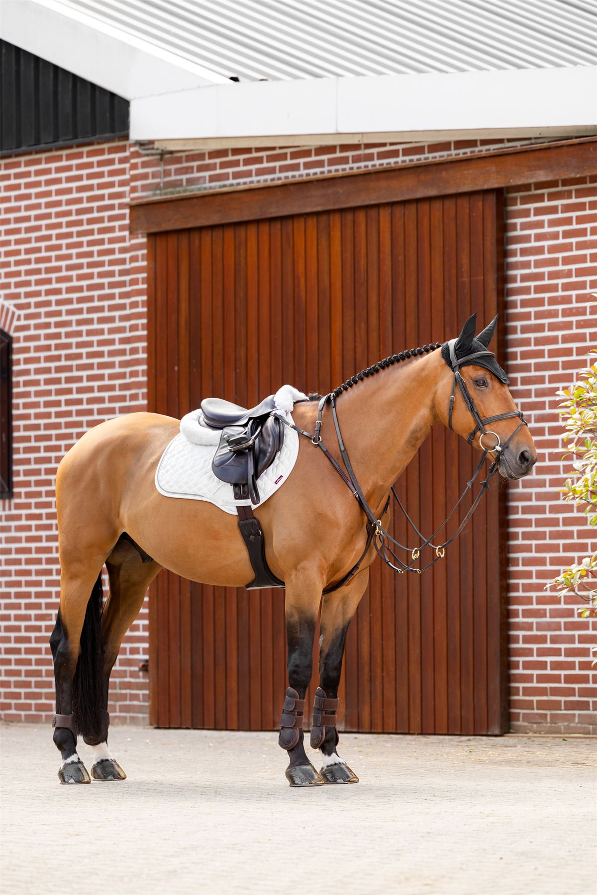 Designed for forward-cut jumping saddles, the Crystal Suede Close Contact Saddle Pad benefits from a bamboo lining, durable faux leather girth protection area and sparkle and braided detail trims for an extra special look. Featuring a luxuriously soft suede-effect upper and a sophisticated new quilted pattern, the Crystal Suede Close Contact Saddle Pad offers a sleek and professional look to your saddle. We�ve finished this pad with stunning sparkle and braided detail trims, creating a classic competition look that's designed to stand out. This pad is uniquely shaped for a secure fit under forward-cut jumping saddles whether you're competing in the ring or practising in the arena. The innovative binding profile is designed to lay flat without pulling out of shape. The pad also features our friction-free bamboo lining, which wicks sweat and moisture directly from your horse's skin for reliable breathability and comfort when working. With its ultra-soft lining, PU leather girth protection area and high wither profile, this saddle pad delivers optimal comfort. Plus, girth keepers incorporate inner loops to offer more girthing options to optimise fit. Pair with the Crystal Fly Hood for your horse, and Crystal Gloves and Belt for you.