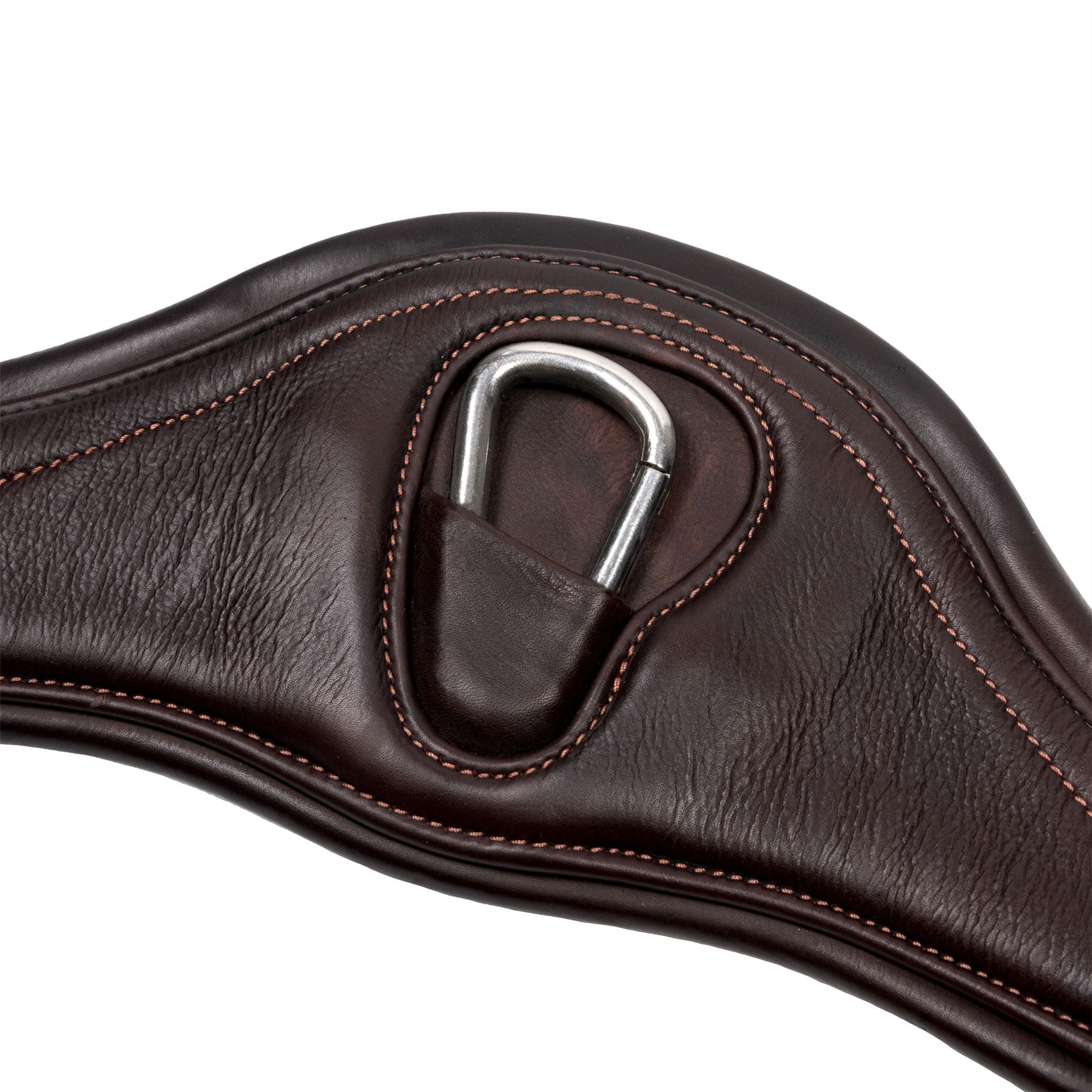 Anatomic high performance long jumping girth that maximises comfort Gel impregnated pockets on leading edge of girth allow muscle to move freely without restriction & sensation of blocking Combination of dynamic gel & ultra soft leather absorbs and spreads pressure evenly across the surface area of the girth Contoured shape and cut back allows maximum freedom & space behind the elbow Thinner tapered ends even pressure at the edge of the girth Allows less restricted movement of the front legs and can improve stride and freedom in the air Enhances saddle stability and eliminates discomfort & rubbing Integrated clip for easy draw rein, breast plate or martingale attachment Strong double elastic straps on either end minimise stretch whilst allowing a degree of flexibility Small D-Rings for optional attachment
