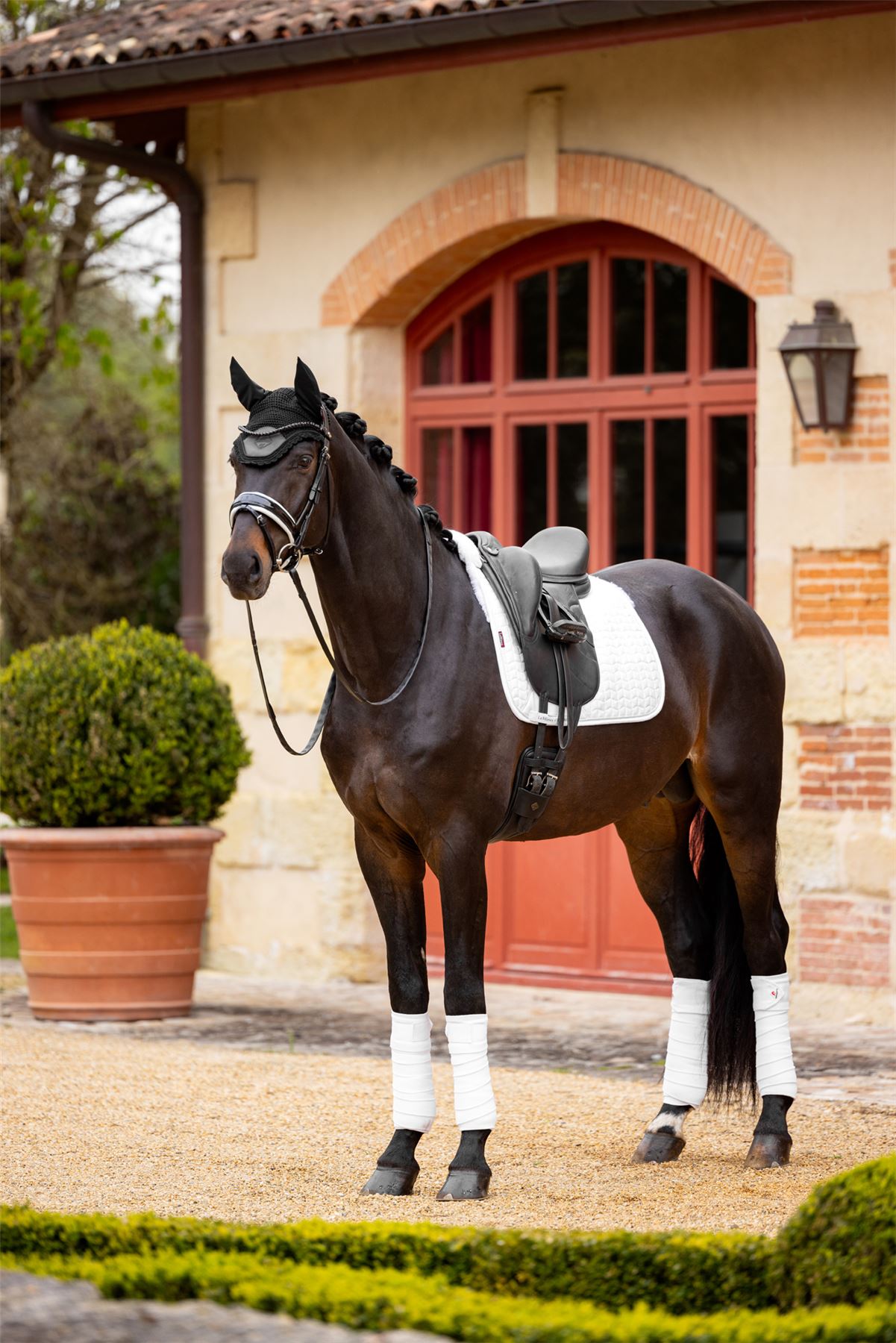 The updated sporty girth protection area shape and texture lend subtle luxury and practical durability to the pad. Hidden inner girth loops deliver a precision fit for additional sticking power.