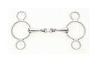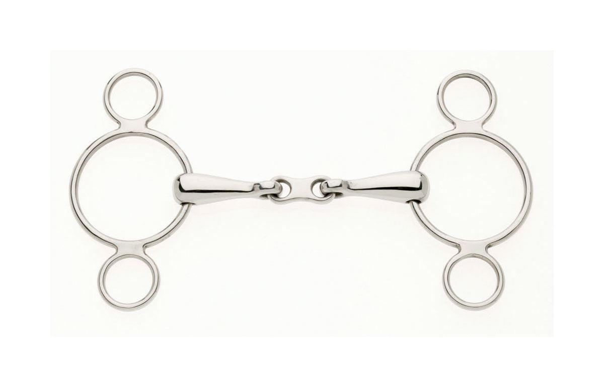 The french link mouthpiece eliminates the nutcracker action. This is ideally used with two reins or roundings with a single rein for the best effect. Exerts poll pressure and a limited gag action.