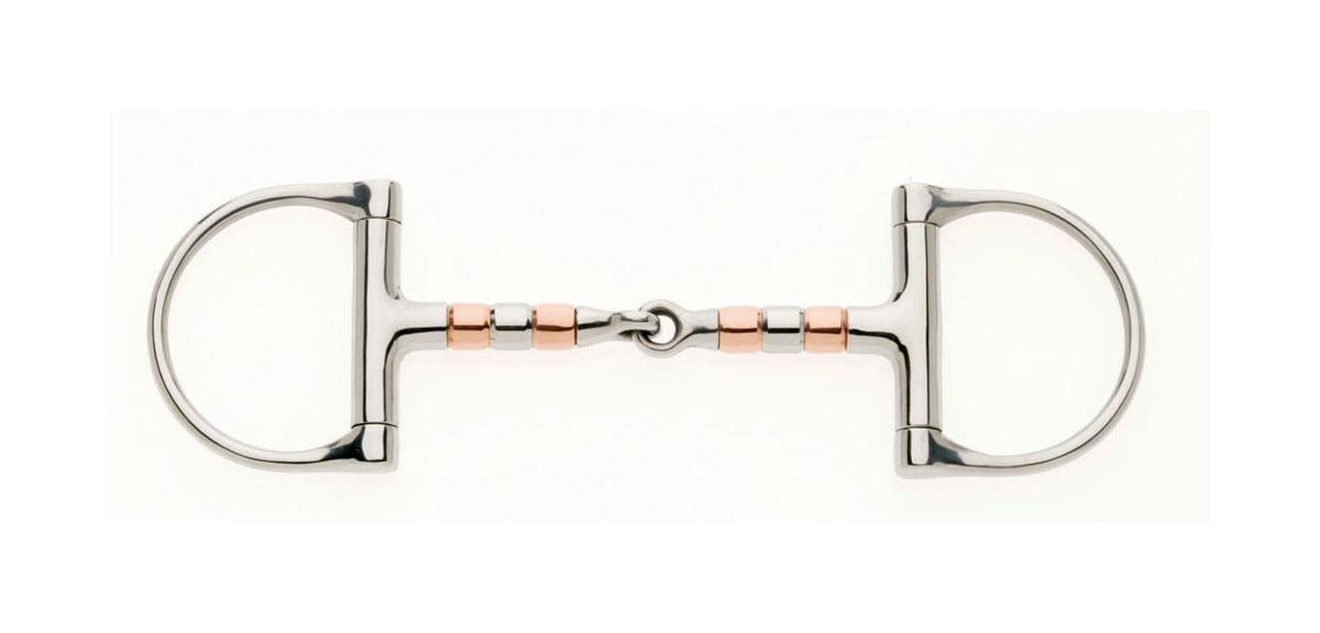 The D cheek copper roller snaffle is often used for horses that need something stronger than a jointed bit if they lean or try to grab the bit. Alternating stainless steel and copper rollers set along the mouthpiece of the snaffle.