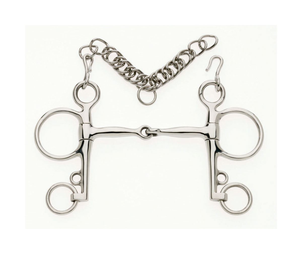 Jointed mouthpiece exerts pressure on the bars and roof of the mouth. Ideally used with two reins, but one rein can be used if roundings are used.