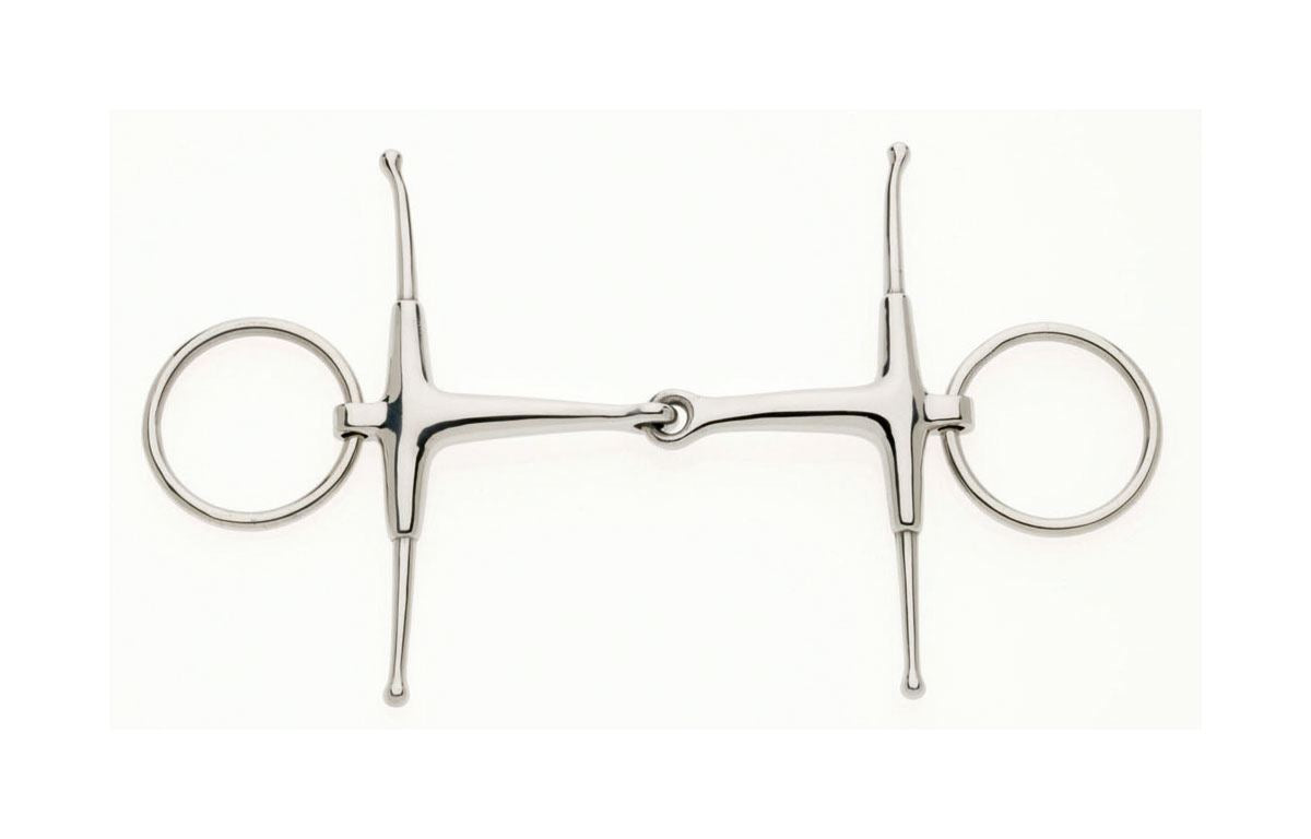 Fulmer jointed snaffle is similar to the full cheek, but with loose rings outside the cheeks to retain the communication found with a loose ring bit. The fulmer cheek also prevents the bit from being able dragged through the horses mouth. This Fulmer snaffle has jointed mouthpiece that acts like a nutcracker on the bars, and will often contact with the horses palate. Fulmer cheek bits are often used on young horses to aid steering, as the cheek gives a more positive action against the cheek when the rider asks for a turn.