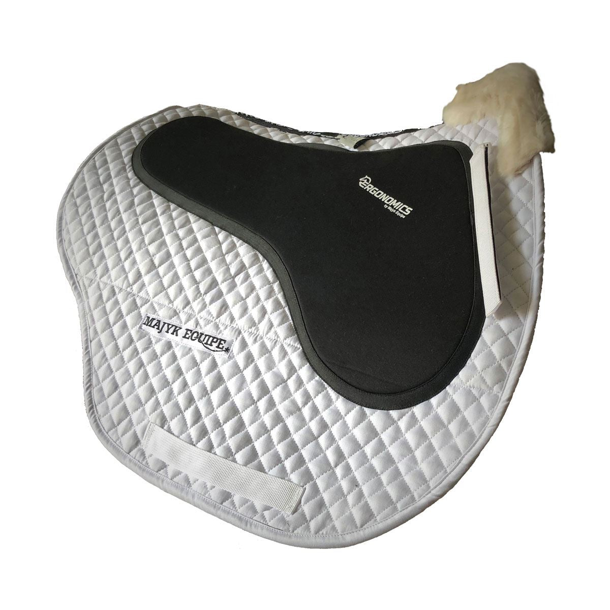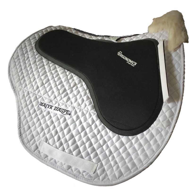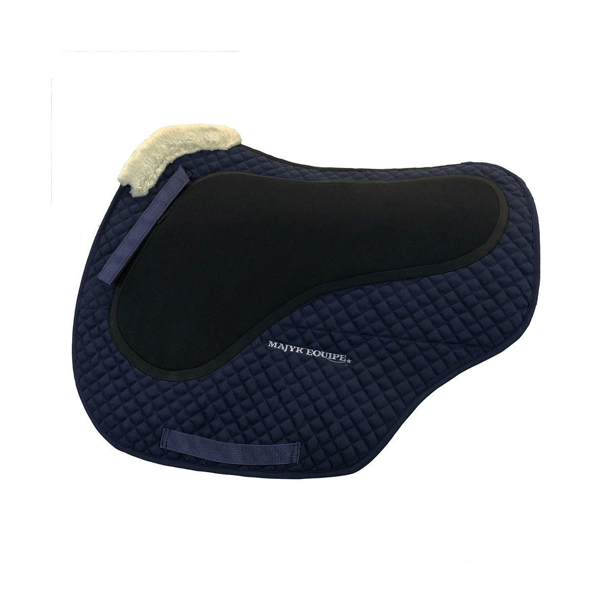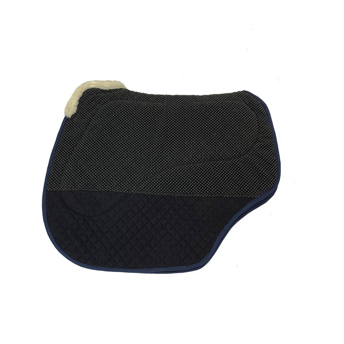 Our favorite pad, polycotton blend quilted material, non slip mesh under layer-this pad will not move, shim pocket allows for saddle fitting, open wither with sheepsking roll eliminates pressure points, forward contour, suitable for show jumpers and eventers.