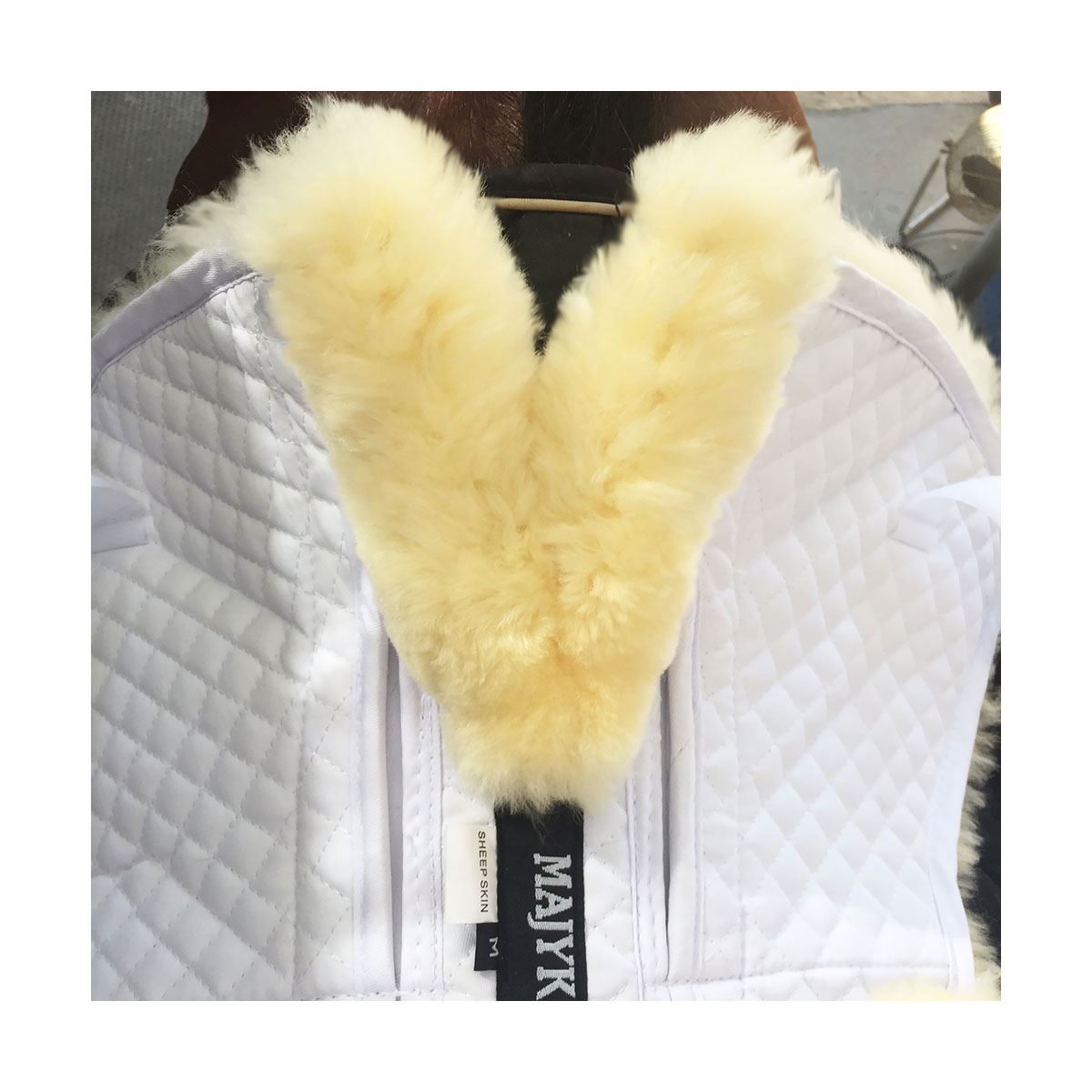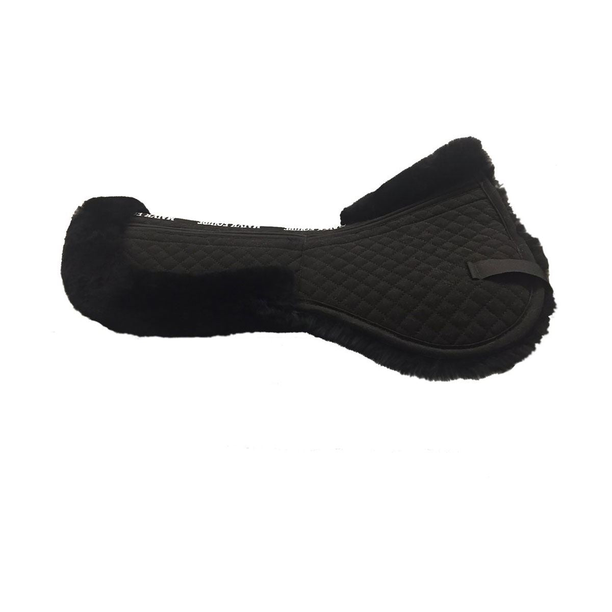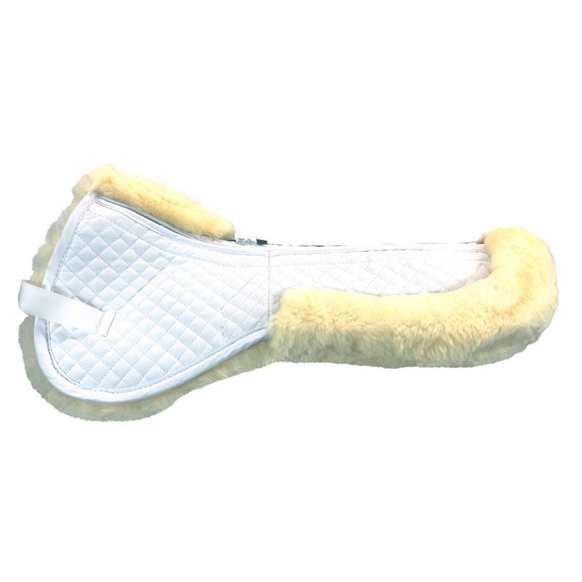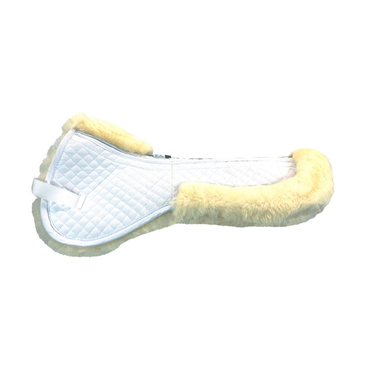 Genuie sheepskin half pad with wither relief and spine channel, long drop eliminates pressure points, four shim pockets provide ultimate fit combinations for use with multiple horses and saddles.