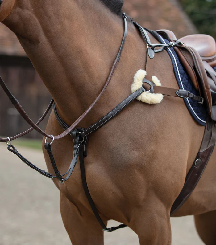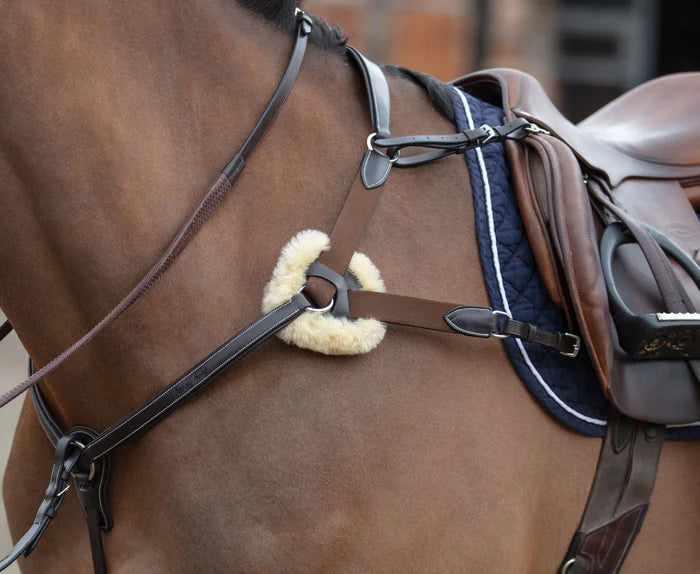 Made from soft leather, this 5 Point breastplate has stainless steel buckles, an adjustable running martingale attachment and sheepskin shoulder pads as well as elastic inserts. The top strap fastens with a trigger clip while the lower strap has a loop for the girth strap. Whilst securing your saddle in place, the elastic and sheepskin pads offer the horse comfort as the pressure is spread over a larger surface area.