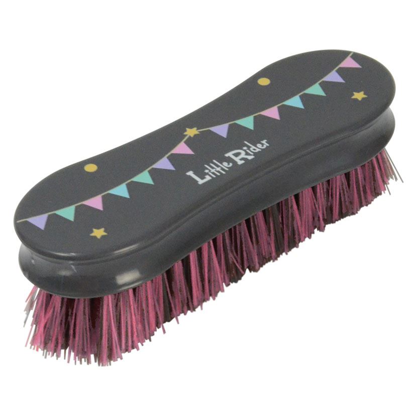 Little Rider face brush featuring Merry Go Round flags and Little Rider logo. Pink and grey two-tone bristles complete the look.