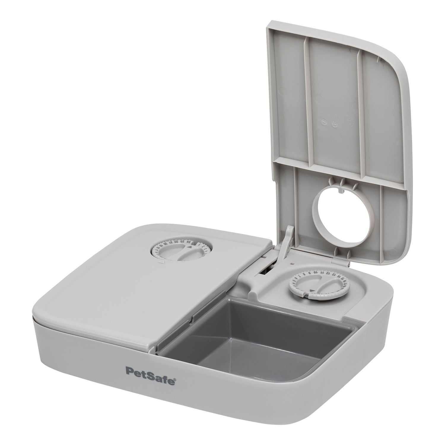 This feeder feeds your pet on time whether you're at home or away. Use the dial timers to schedule your cat or dog's meals up to 24 hours ahead of time, in half-hour increments. With scheduled mealtimes, you can control your pet's portions to keep them happy and healthy. The removable inner tray has two compartments that each hold up to 355ml of dry or semi-moist food. Although your pet may use their paws to try and pry the feeder open, the tamper-resistant lids make sure that even the most persistent pets can't get to the food ahead of schedule. When the feeder needs cleaning, simply remove the tray and place it in the top rack of the dishwasher.