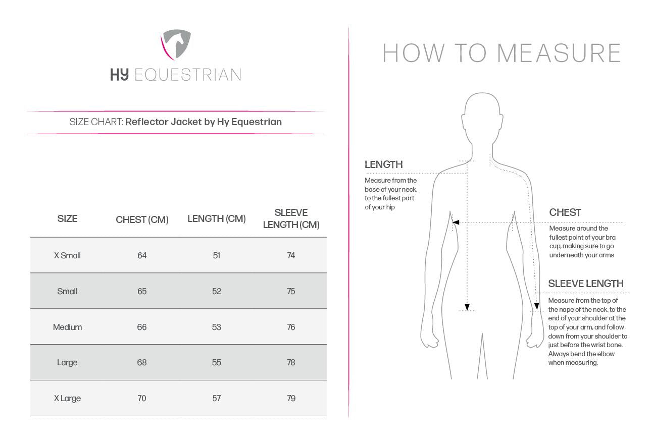 Be safe and seen during the darker evenings wearing this reflective jacket by Hy equestrian. The breathable fluorescent yellow material provides visibility. Additional silver reflective patterns creates optimum visibility.