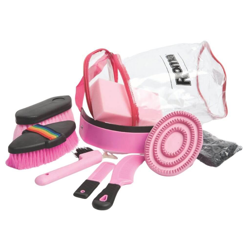 Shop now at Just Horse Riders for the Roma Cylinder Grooming Kit, a nine-piece set that's a must-have for every equestrian enthusiast. It's not just a product, but an all-in-one solution for your horse's grooming needs. The kit includes a body brush, a dandy brush, a sweat scraper, a curry comb, a hoof pick with brush, a mane comb, a mane and tail comb, rubber bands and a handy sponge. All these essentials are included in a reusable bag, ensuring everything is kept together and clean. This makes it both practical and convenient for you and your horse's grooming routine.