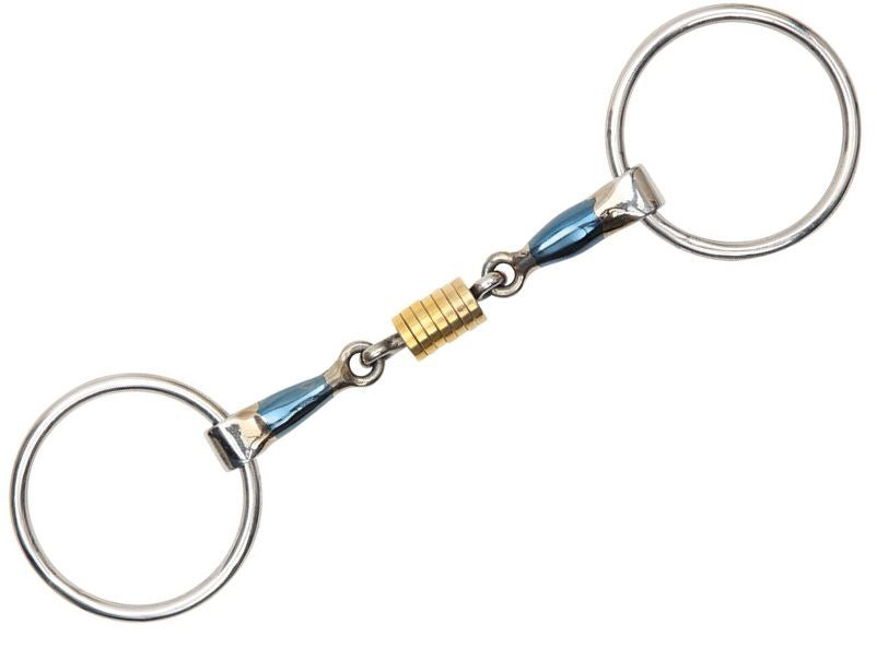 Experience the magic of the Shires Blue Sweet Iron Loose Ring With Roller, expertly constructed to follow the angle of the tongue and help prevent your horse from fixing and leaning. This unique feature, thanks to a loose ring cheek, ensures greater flexibility and comfort for your horse. It includes loose, brass alloy discs in the centre that assist in soothing a fussy tongued horse. Explore the Shires range at Just Horse Riders for more premium products.
