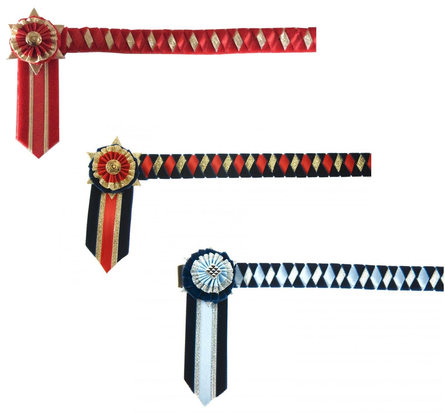 Each Boston Browband is individually hand-plaited on 3/4" (19mm) leather. The diamond design uses velvet ribbon to border satin and lurex ribbons and is beautifully finished with a three layered, six point star rosette and V-shaped tabs.