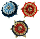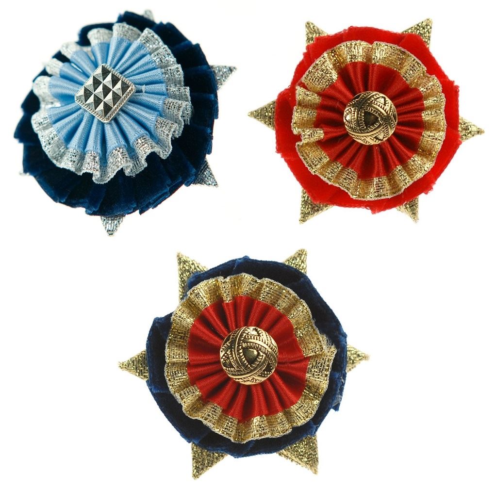 A buttonhole with small pin using velvet, satin and metallic ribbon with stud.