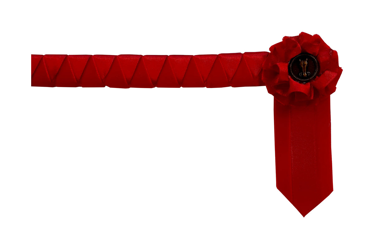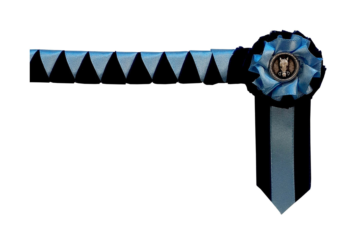 3/4" Leather browband with velvet and satin ribbon with flag and 2 layer rosette horse head stud.