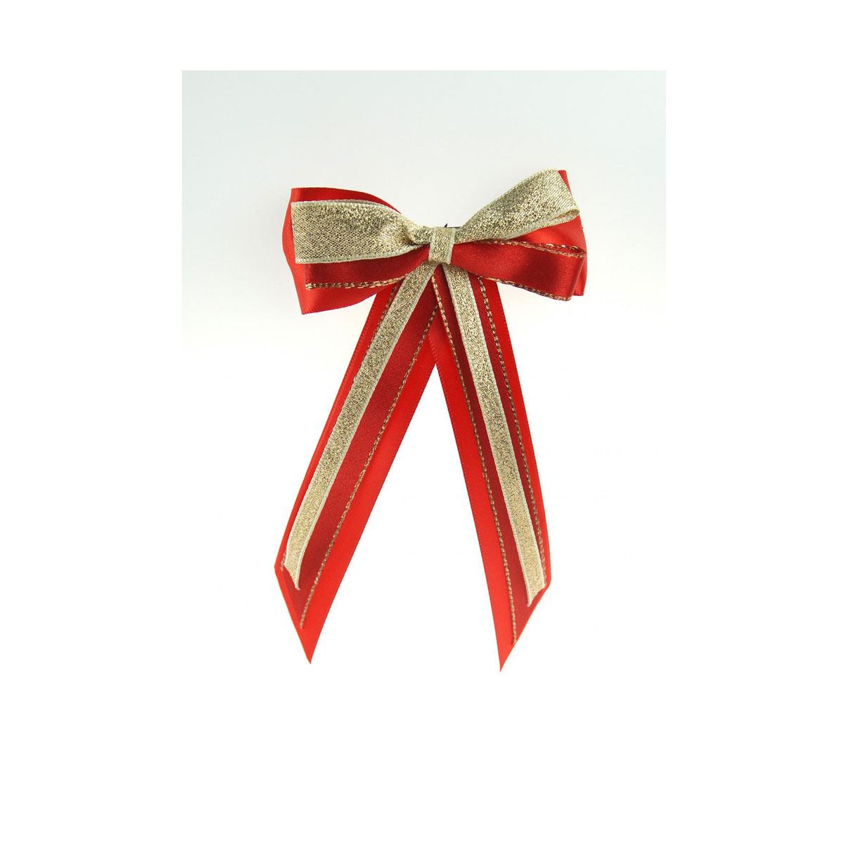 Made up of three layers of satin and lurex ribbon to create a charming hair piece. Incorporates a French barrette clip to easily secure into place.