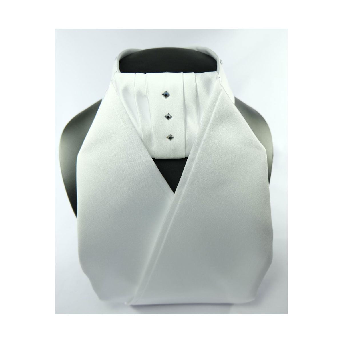 A ready tied stock made from 100% polyester satin. Non pill. Designed with three diamond shaped crystals on the centre neck piece. Designed with a hook and loop fastening to allow plenty of adjustment and includes a buttonhole to attach to a shirt.