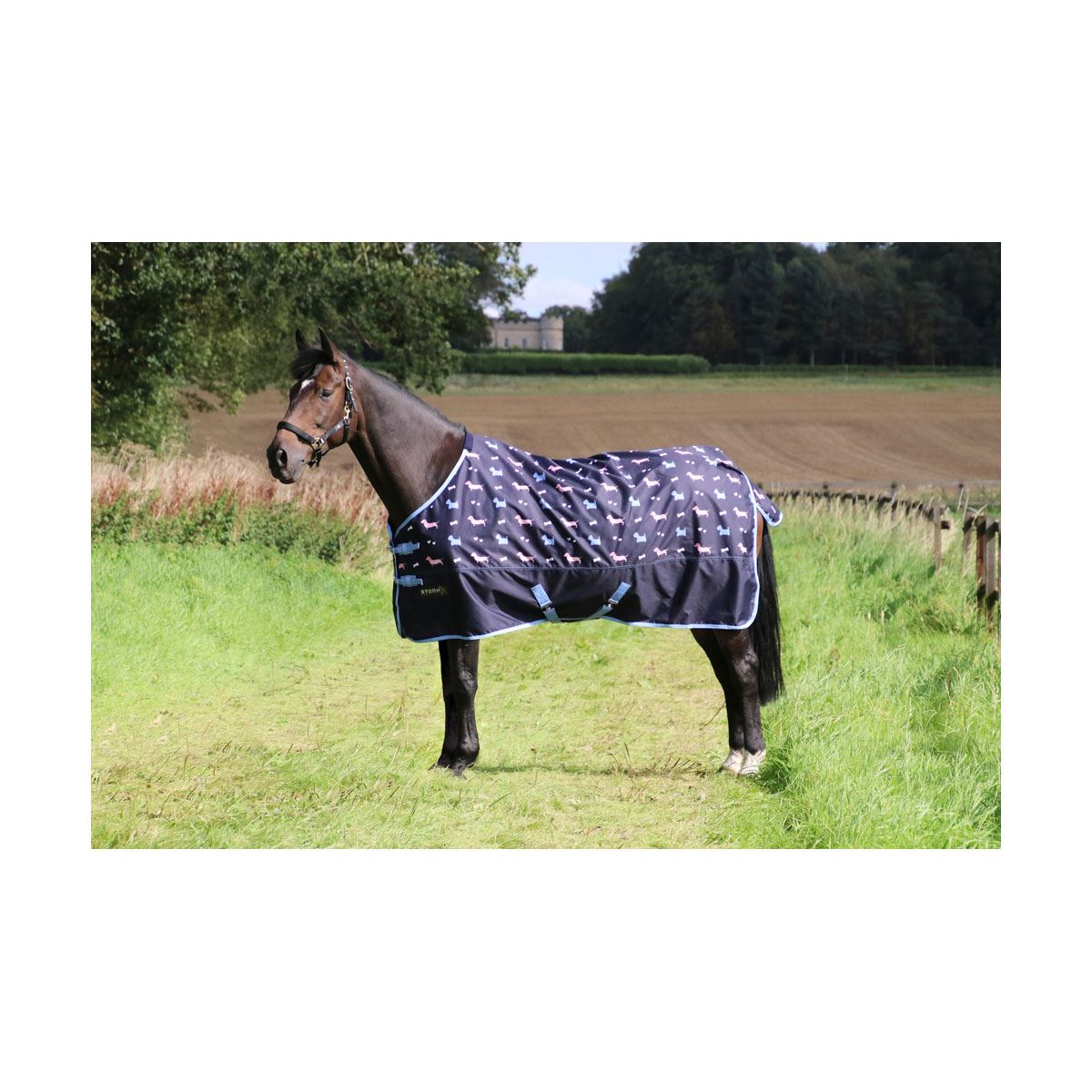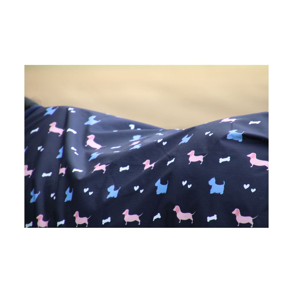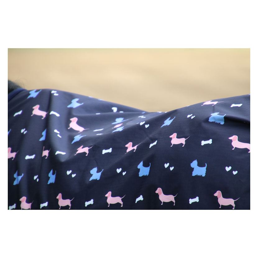 Sausage Dogs and Westies adorn this stylish turnout rug, complete with bones and love hearts, it�s the perfect rug for dog lovers. The contrasting taped seams and fastenings really make this rug stand out. Featuring twin buckle chest fastenings, adjustable cross surcingles and adjustable leg straps. A fleece lined wither area prevents rubbing and a large tail flap adds extra protection. The waterproof 600 denier ripstop material with a full lining will keep your horse dry on the showery summer days. Perfect if your horse needs a bit of extra protection from the elements.