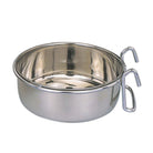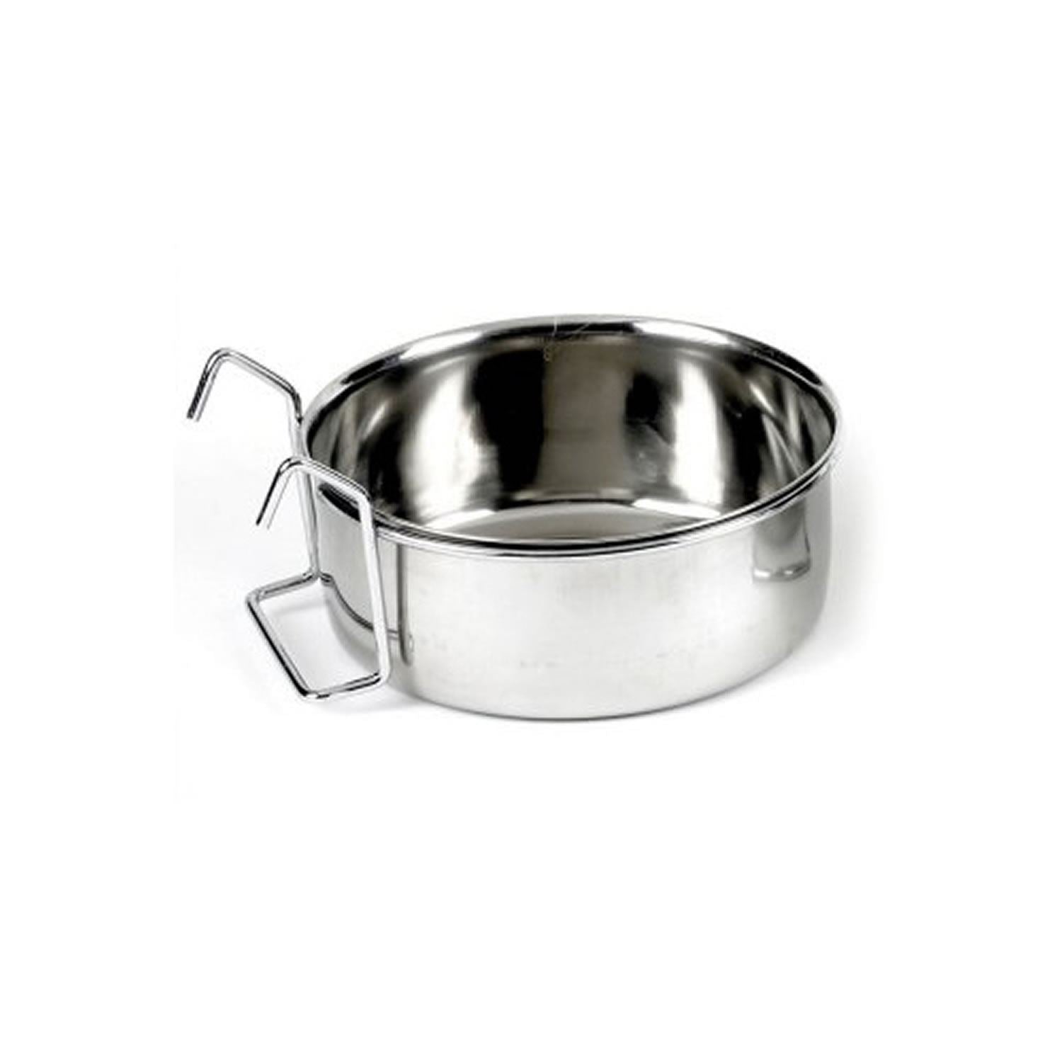 Stainless steel D-cup with stainless steel hanger and removable stainless steel bowl. Suitable for water, seed or grit. Can be used in coops, aviaries or pet housing.