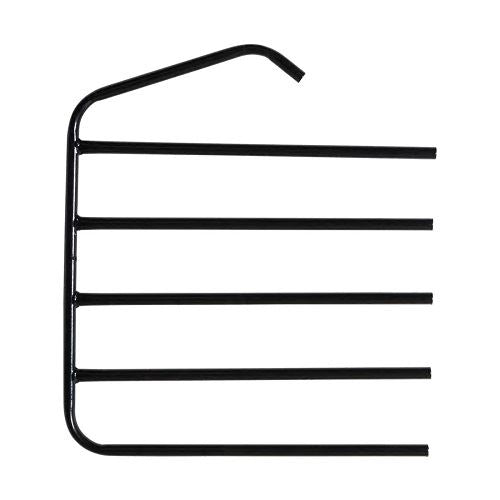 Load this great new hanger with 5 numnahs/saddle pads. Hang it on a rail - flat to wall or on a hook. Use in multiples or singly. This is perfect for shop displays and tack room storage. It makes a very compact presentation of that 'pile' in the shop or tack room! Balanced to create a slight onward slope to maintain tidy display or storage. Black STUBBYFINE coated. Strong steel construction.