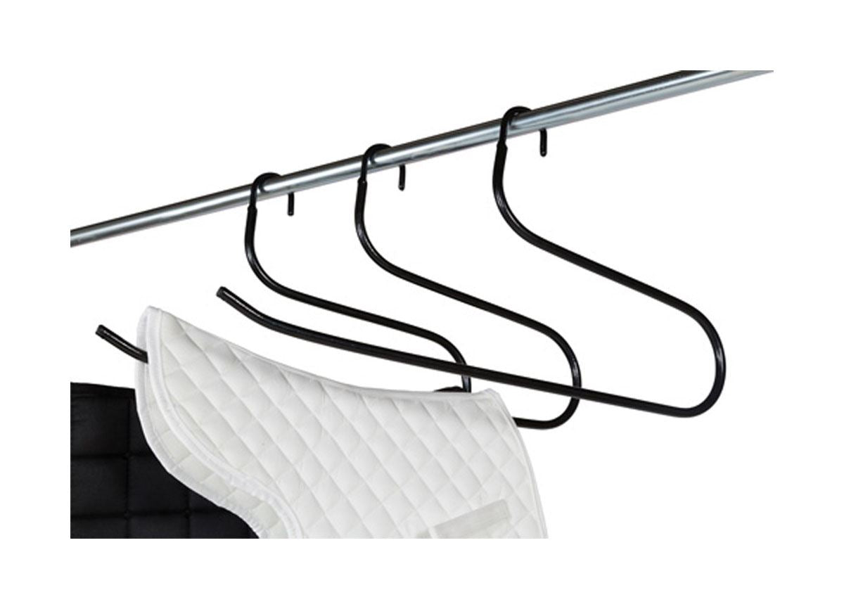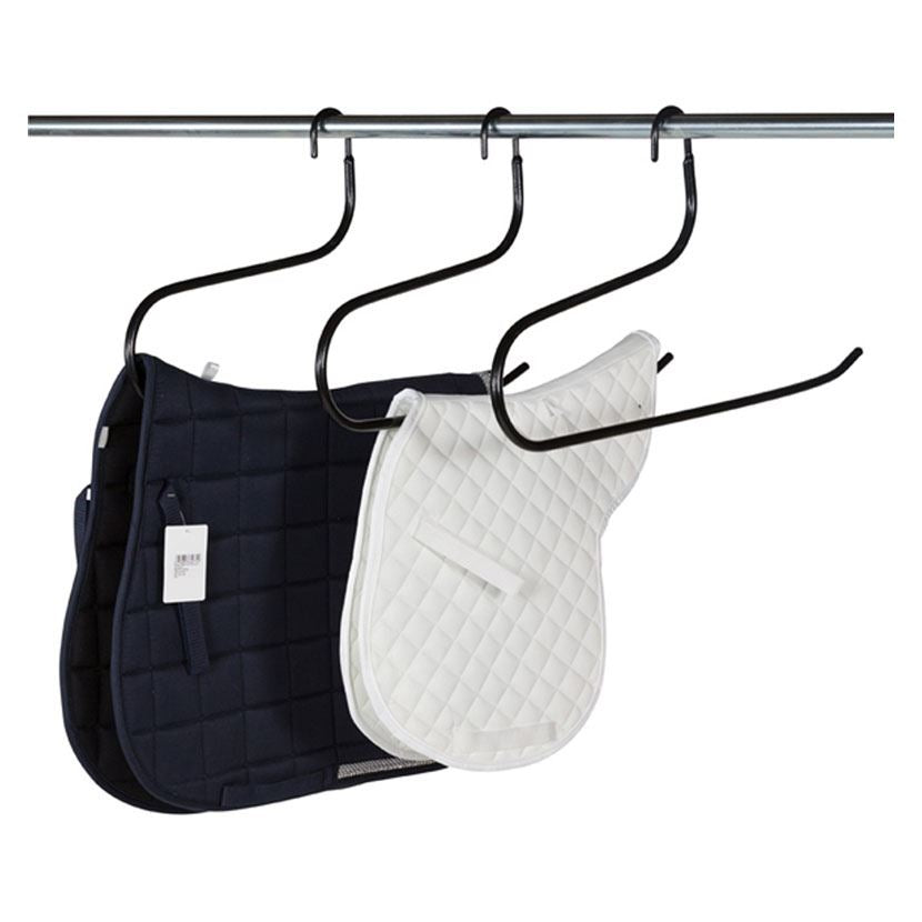 Hang up saddle cloths and numnahs on a dress rail easily. The designed balance is a slight forward slope and the rail kicks up slightly at the end - both to keep numnahs safely on, yet easy to remove. They hang on any dress rail and can therefore be part of a combined display with clothing. Shop owners at BETA 2015 said they wanted a product like this�. Strong tubular steel construction with solid hook. Black STUBBYFINE coated.