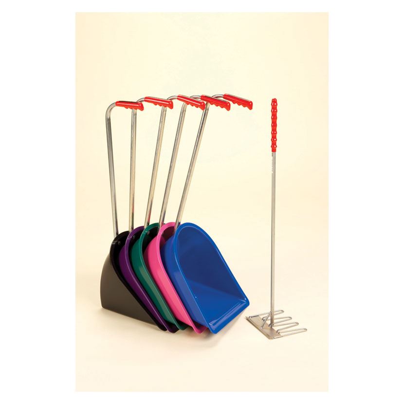 A really easy method of collecting droppings in the stable, yard and at shows. Also frequently used in the paddock backed up with a barrow. Smart Stubbythene moulding. Now with superior Scraper Rake as standard. This consists of a scraper on the back of our original rake. Excellent for shavings, wet bedding and on concrete/rubber floors or grass. Bright zinc plated one piece construction. Height 58cm, Width 36cm, Depth 32cm, Weight 1.7kg.