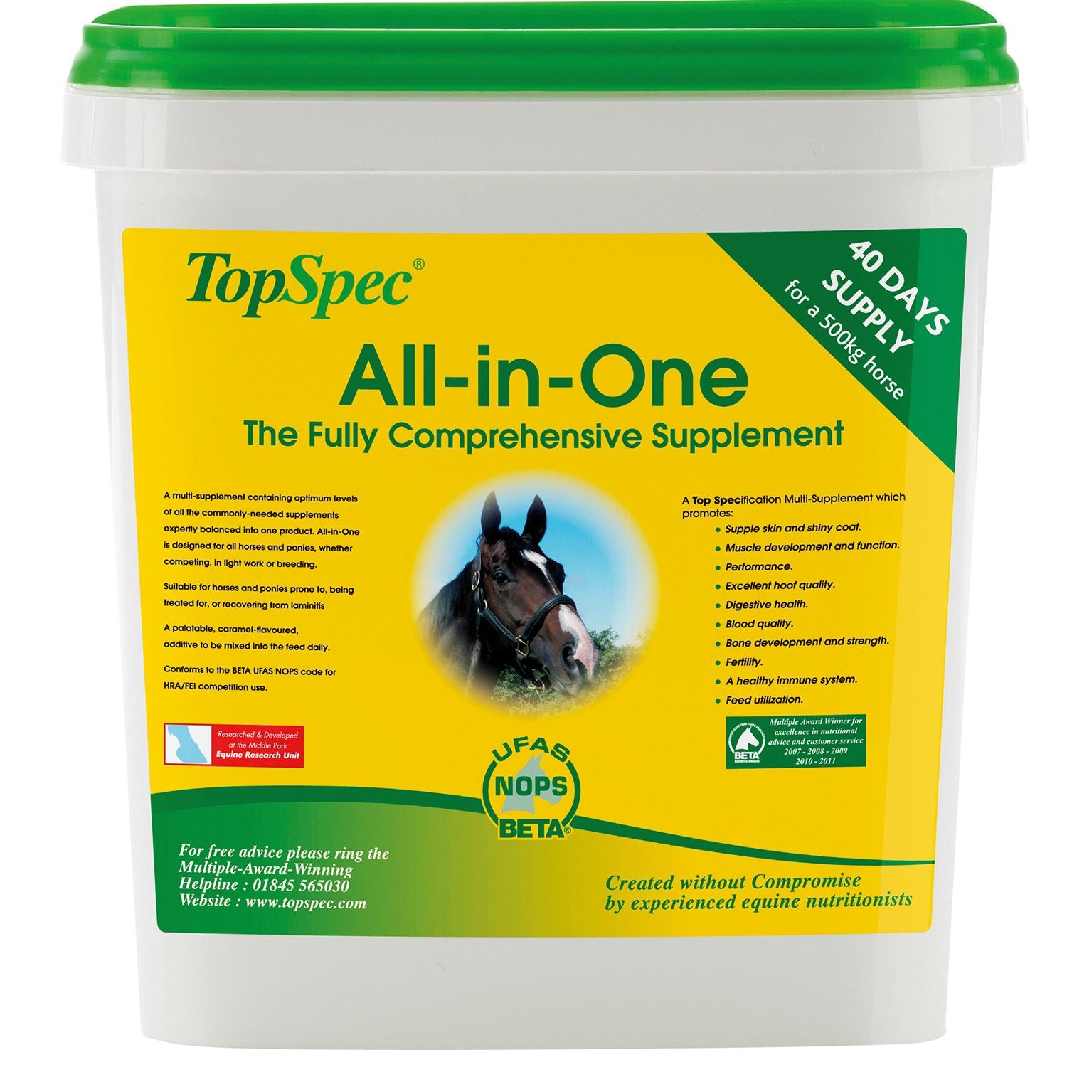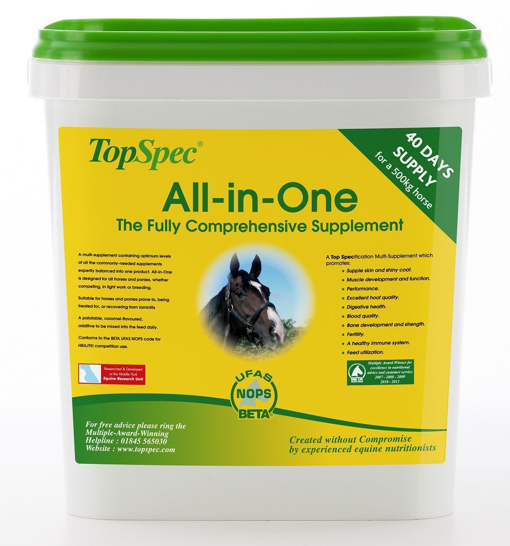 Shop now at Just Horse Riders for the Topspec All-In-One, an exceptional multi-supplement designed for optimum horse care. This product is expertly balanced with all the commonly needed supplements, making it an ideal choice for all horses and ponies, regardless of whether they're competing, in light work or breeding.