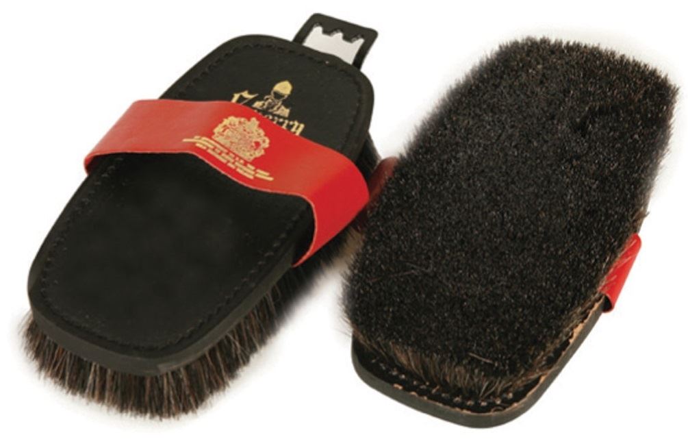 The brush is beautifully crafted on a black leather board, elegantly branded in gold, and fitted with a convenient wrap over leather strap. Its extra-large surface area and rectangular shape make grooming more efficient, saving you time and ensuring your horse's coat is thoroughly cleaned.